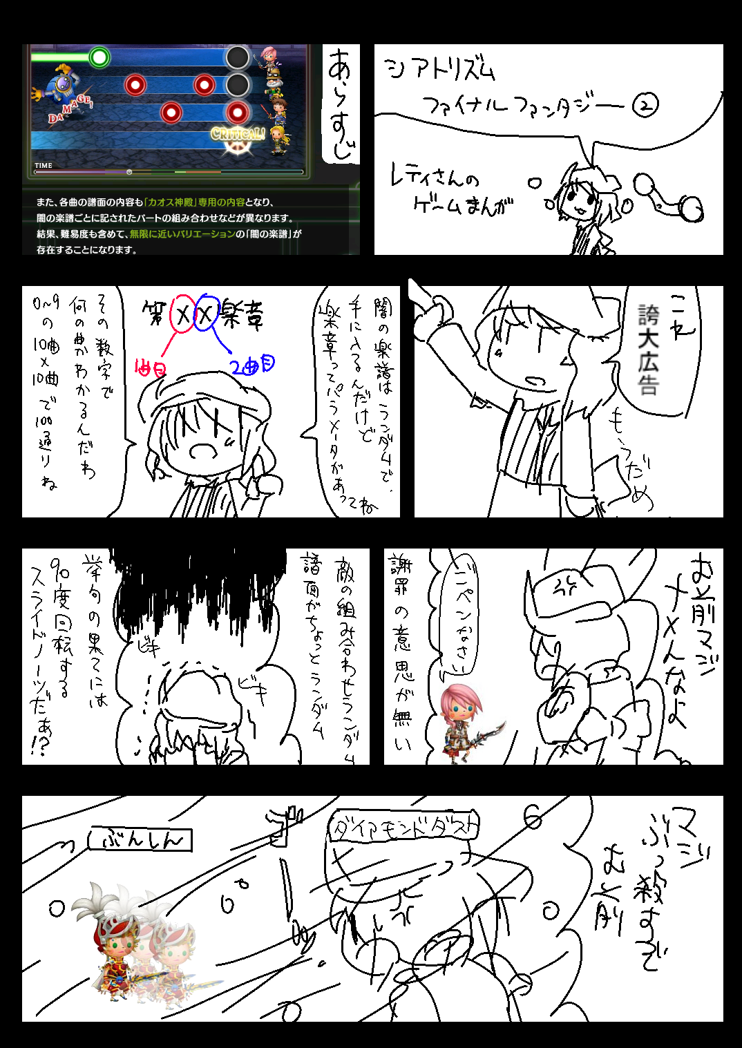 前の時点ではまぁ…まぁ許せたかな…って感じだけどもう我慢の限界だよ、こんな音ゲー出して恥ずかしく無いの、FF13の時も思ったけどプレイ時間引き延ばしの要素はホントクソ!25年間FF作り続けて出来るゲームがこれかよ!猛省すべきであるとレティさんは主張します!